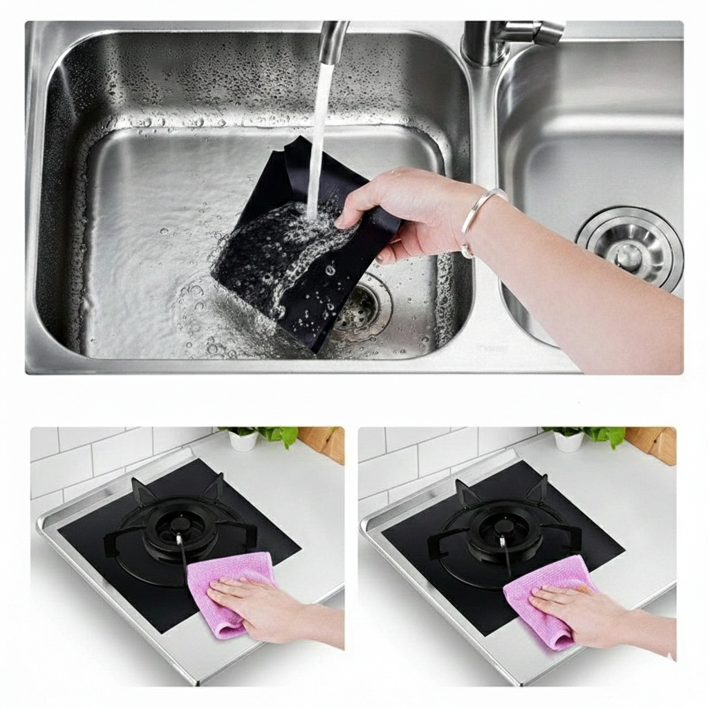 O protetor antiaderente reutilizável para fogão a gás evita gordura e manchas difíceis, facilitando a limpeza do dia a dia. Basta remover e lavar com água e detergente para manter seu fogão sempre limpo.