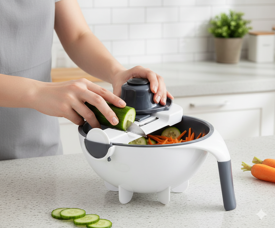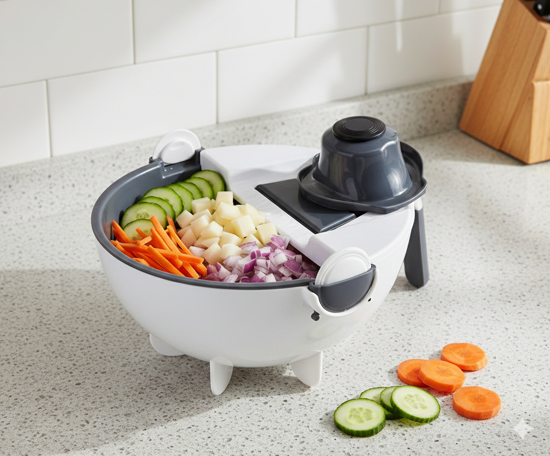 Transforme o preparo das suas refeições em uma tarefa rápida e sem esforço. O sistema multifuncional permite cortar e preparar legumes e frutas com eficiência e organização.